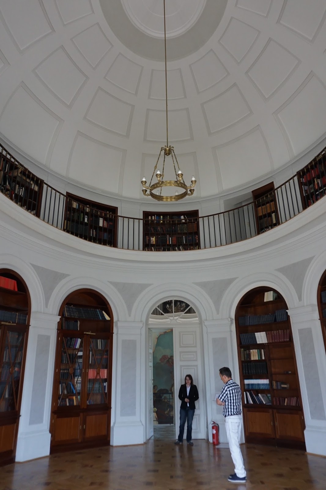 Ovális kupolás könyvtárterem Vajay Szabolcs hagyatékának könyveivel, aki 1944 után Argentínában, Franciaországban, Svájcban élő történész, genealógus, heraldikus volt.