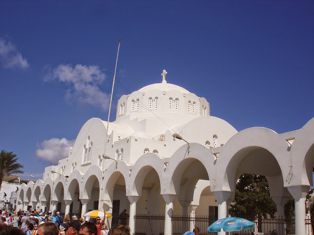 Busszal átmentünk a fővárosba Firába. Háromféle láva kőzet van a szigeten, fehér, fekete, vörös, ennek megfelelően a strandok is ilyen színűek. Közben elhaladtunk Brad Pitt és Angelina Jolie háza előtt is, túl sok minden nem látszott belőle a magas kerítés miatt, jellegzetes fehér görög ház. Itt 3 és fél órás szabadidő volt. Kellett is, épp végig barangoltam a